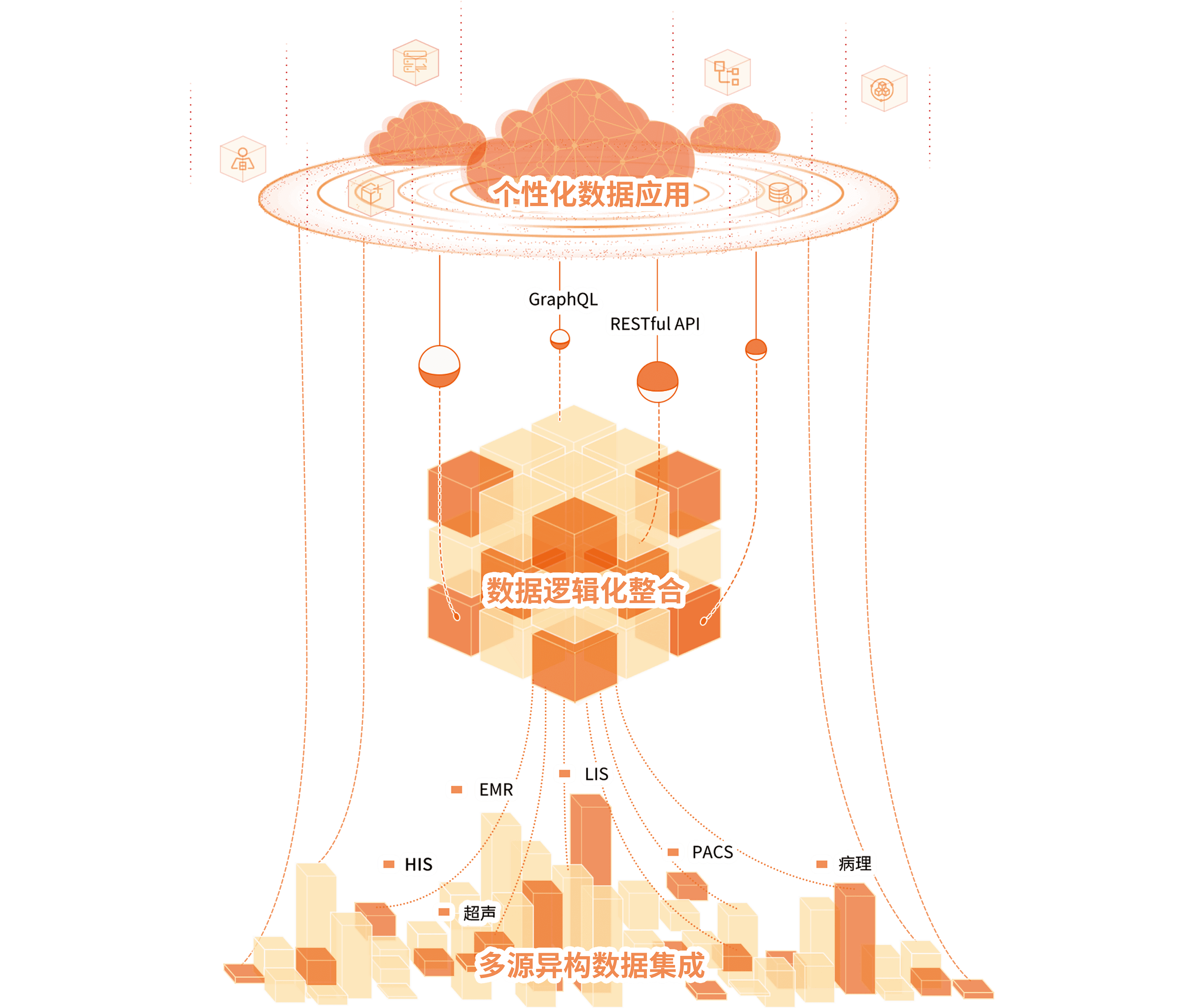 醫(yī)眾醫(yī)療數(shù)據(jù)服務(wù)采用 Data Fabric 數(shù)據(jù)編織的架構(gòu)理念,幫助用戶應(yīng)對在數(shù)據(jù)資產(chǎn)化進(jìn)程中產(chǎn)生的復(fù)雜性、分布式、多元化等因素,從單純的以數(shù)據(jù)應(yīng)用為核心建設(shè)數(shù)字化,向體系化的數(shù)據(jù)服務(wù)能力建設(shè)轉(zhuǎn)型。